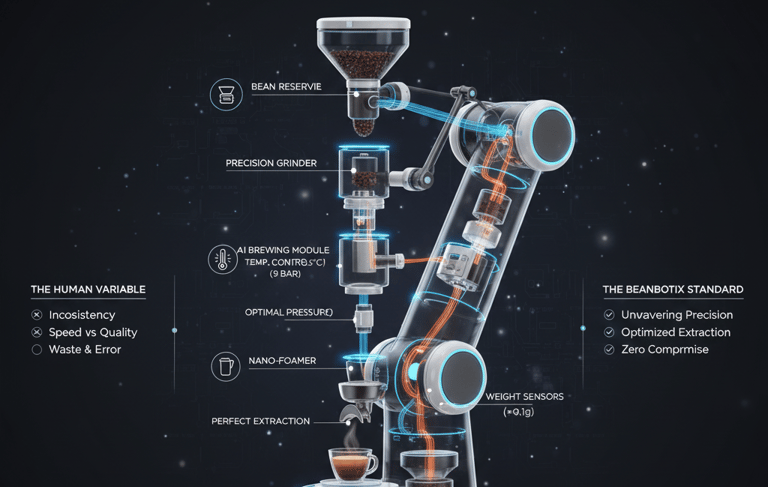 Unwavering Precision: Our proprietary AI-driven robotics execute every step, from bean grinding to milk frothing, with micron-level accuracy, ensuring identical perfection, every single time.